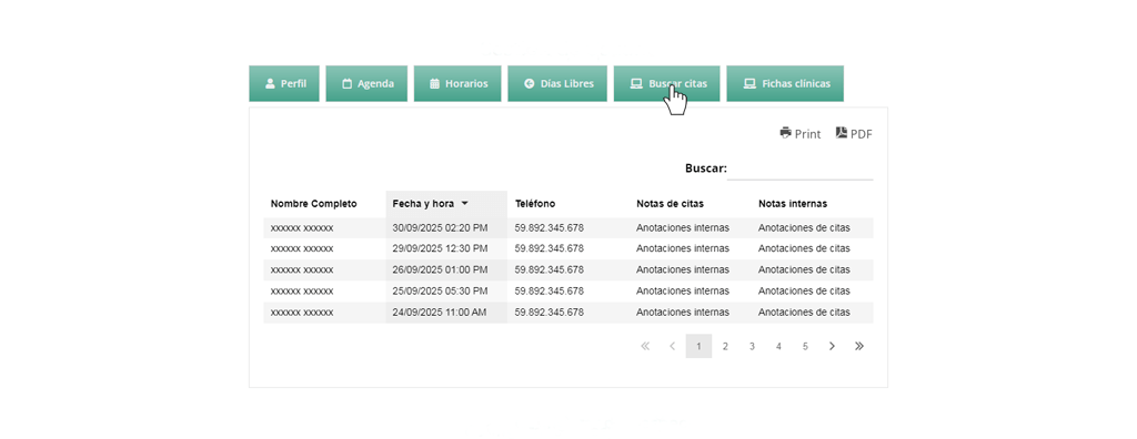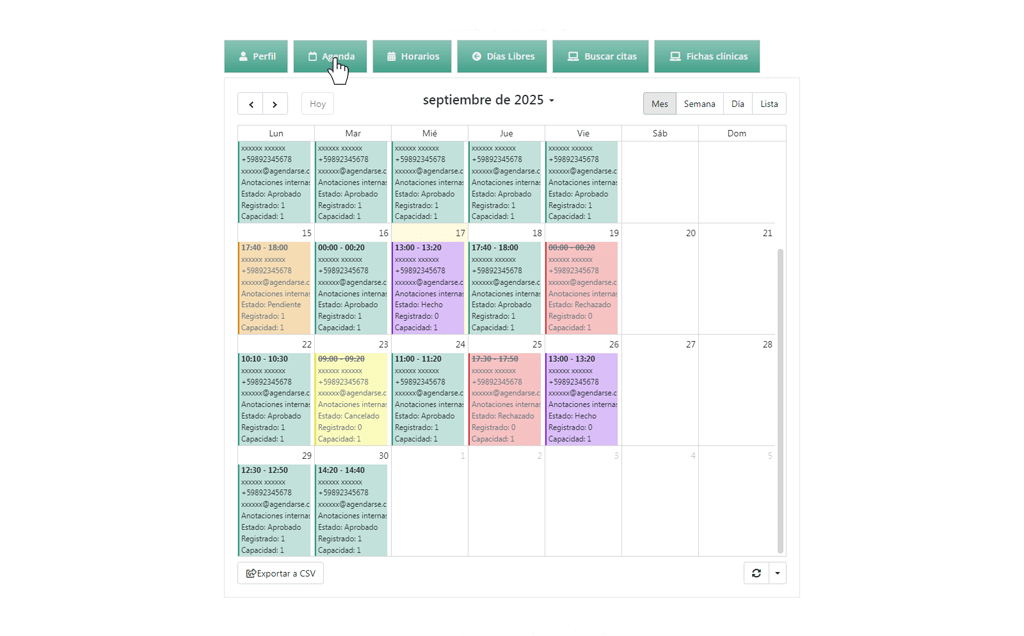 Ideal para encontrar citas ya confirmadas, pendientes o canceladas, sin necesidad de recorrer toda la agenda visualmente.