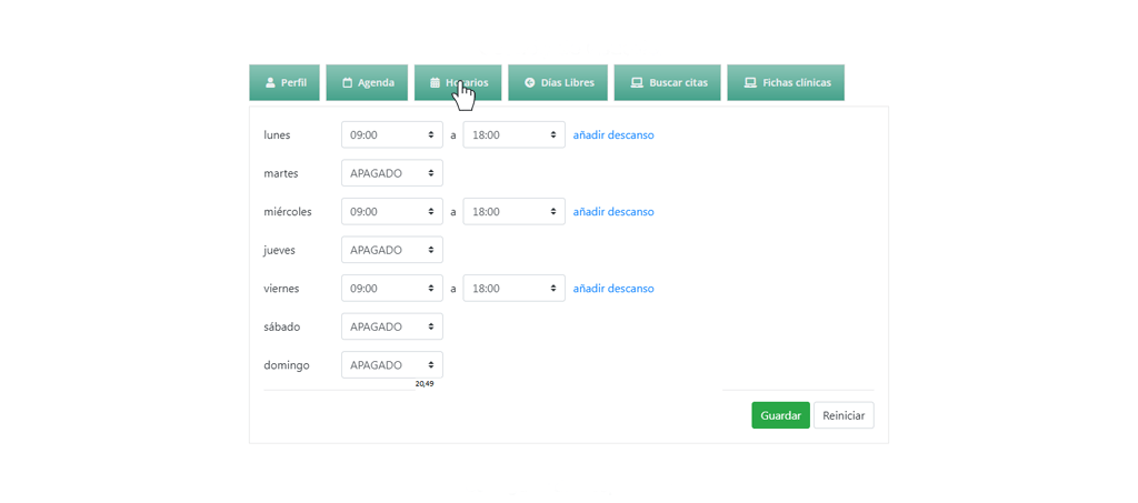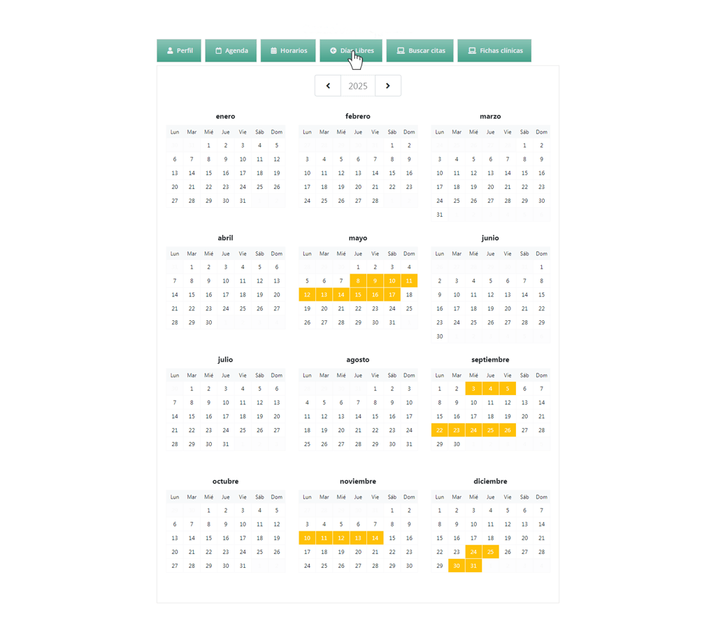 En la pestaña Días Libres podrás indicar los días que deseas inhabilitar, bloqueando así su disponibilidad de agendamiento.